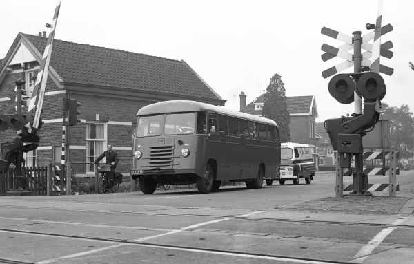 Een korporaal-1 chauffeur van de Motortransportdienst Soesterberg stuurt zijn DAF B 1300 C533 3-tons 4x2-autobus over een spoorwegovergang: de samenwerking met DAF leverde Defensie een diversiteit aan voertuigen op, maar de defensie-industrie in Nederland bleef relatief klein. Foto Beeldbank NIMH