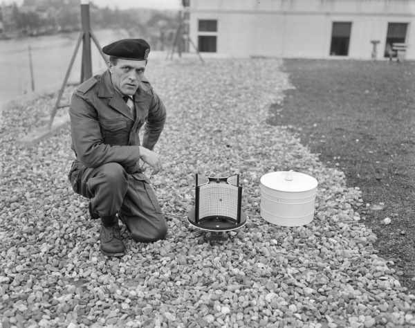 De ABC-dienst van de BB plaatst meetapparatuur voor het waarnemen van atoombomexplosies op het dak van het stadhuis van Aalsmeer, 1962: in de decennia daarop nam de twijfel over de mogelijkheid de gevolgen van een atoomoorlog effectief te bestrijden toe. Foto Nationaal Archief/Joop van Bilsen, Anefo