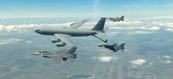 Roemeense vliegers in Nederlandse F-16’s tanken in de lucht boven Roemenië bij een Amerikaans tankvliegtuig. Foto EFTC
