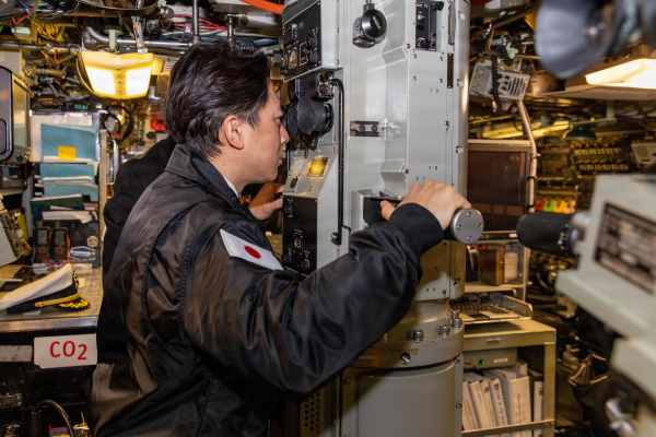 De Japanse minister van Defensie Shinjiro Koizumi kijkt door de periscoop van de onderzeeboot USS Seawolf. De NSS erkent dat de dreigingen tegen Japan ‘ernstiger en complexer’ zijn geworden. Foto US Navy, Daniel Providakes
