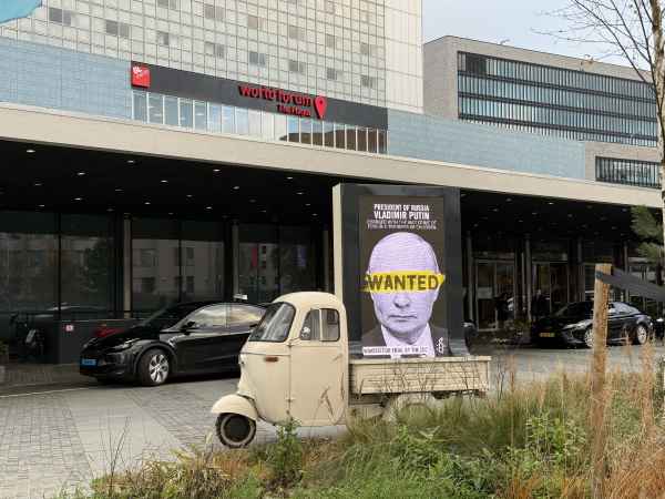 A billboard calling for the arrest of Russian leader Vladimir Putin is placed outside the venue hosting the 24th session of the ICC Assembly of States Parties in The Hague, Netherlands, on December 4, 2025. Foto ANP/Anadolu, Selman Aksunger