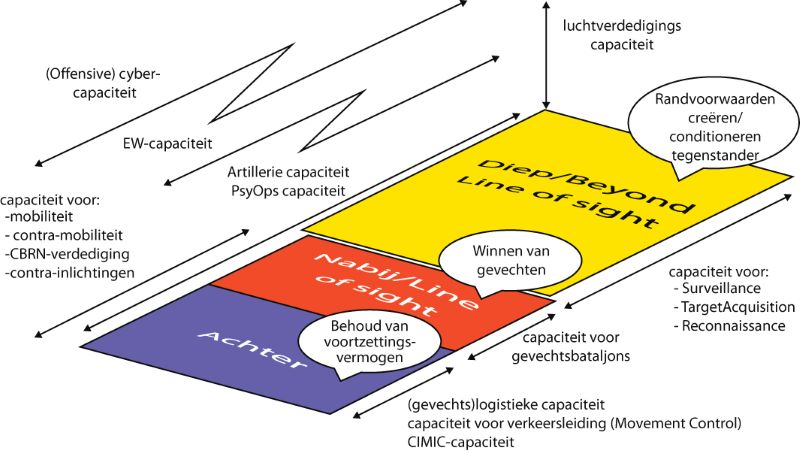 Landeenheden zijn nodig om grondgebied te verdedigen, beheersen en indien nodig te heroveren. Alleen met grondeenheden zijn grondeenheden van een tegenstander stoppen. De bezuinigingen en reorganisaties na de val van de Berlijnse Muur in 1989 hebben geleid tot een enorme vermindering van capaciteit om mee te vechten. Legerkorpsen en divisies hebben nauwelijks nog capaciteit om in voorkomend geval het gevecht van de brigades plaatselijk en tijdelijk te versterken. Daarnaast is de kennis en ervaring van het vechten met brigades in samenhang met divisies en legerkorps grotendeels verdwenen. De technologie van vandaag maakt het mogelijk om de vijand diep in door hem bezet en beheerst gebied met capaciteit aan te grijpen. In het tactische optreden moeten de mogelijkheden van bestrijden in de diepte worden benut. Immers, het afbreuk doen aan de vijandelijke gevechtskracht moet zo vroeg mogelijk beginnen. Effectieve inzet leidt ertoe dat de vijand zijn gevechtskracht in het directe gevecht met de eigen gevechtseenheden niet optimaal kan en ongecoördineerd moet gebruiken. Effectieve inzet heeft ook invloed op zijn voortzettingsvermogen. Fysieke bestrijding diep achterin het gebied van de vijand heeft daarnaast invloed op zijn morele component.