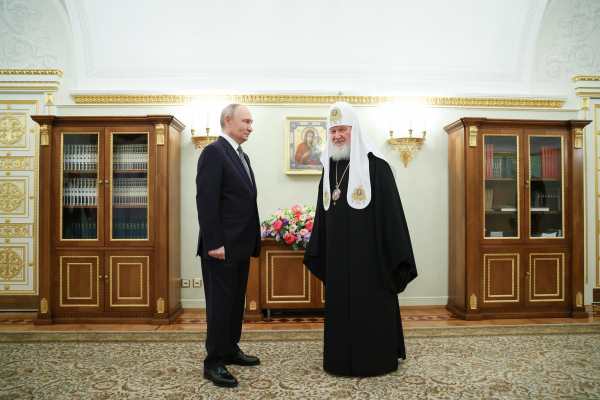 Vladimir Poetin ontmoet patriarch Kirill: de Russische president weet zich gesteund door de Orthodoxe Kerk. Foto ANP/EPA, Alexander Kazakov/Spoenik/Kremlin Pool