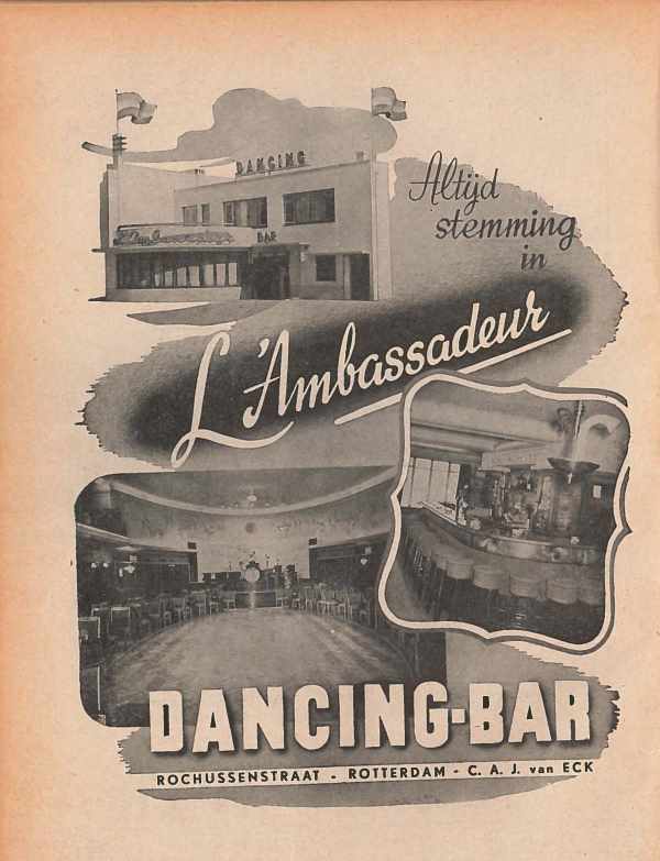 Zo prees dancing-bar L’Ambassadeur in Rotterdam zichzelf vlak na de Tweede Wereldoorlog aan met de belofte ‘altijd stemming’, maar op de bijgaande foto’s stonden lege lokalen. Wie er toch heen wilde was ‘in 2 minuten heerlijk geschoren zonder ‘inzepen’’ als hij Bart-Ex snelscheercrème gebruikte.