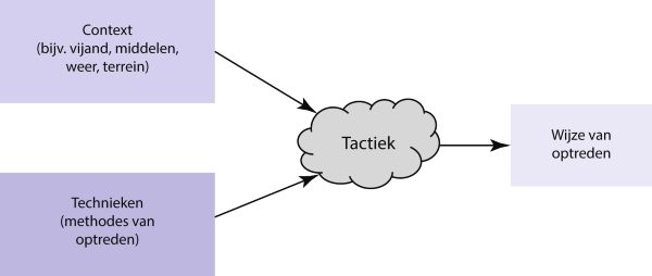 Hoewel tactiek en het tactische niveau lastig te onderscheiden zijn, gaat tactiek over hoe te denken in het gevecht (‘door A en B verspreid op te stellen kan ik de vijand omtrekken’) en het tactische niveau gaat over het organiseren van deze activiteiten (‘hoe plan en stuur ik eenheid A en eenheid B om op die verspreide posities te komen’). Het tactische niveau draait om het uitvoeren van activiteiten die bijdragen aan het behalen van operationele doelstellingen. Bedenken welke activiteiten effectief bijdragen aan het behalen van de doelstellingen doet men door na te denken over de theorie gebaseerd op tactiek: ‘Op welke manier moet ik mijn middelen inzetten om de vijand te verslaan of mijn opdracht te behalen?’ ‘Kan ik de vijandelijke positie overnemen door gebruik te maken van misleiding of moet ik een omtrekkende beweging maken?’
