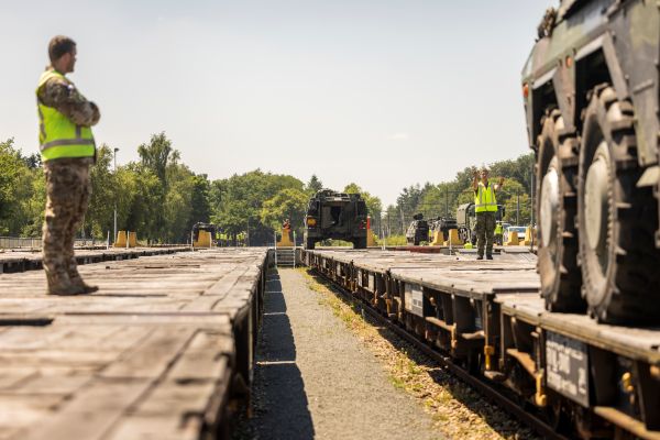 Militairen laden voertuigen op een trein. Het Ecosysteem Logistiek, waarbij Defensie een beroep kan doen op partners om één brigadetaakgroep, via land, over een afstand van 1500 kilometer voor maximaal één jaar te ondersteunen, is een voorbeeld van een succesvolle casus. Foto MCD, Jarno Kraayvanger