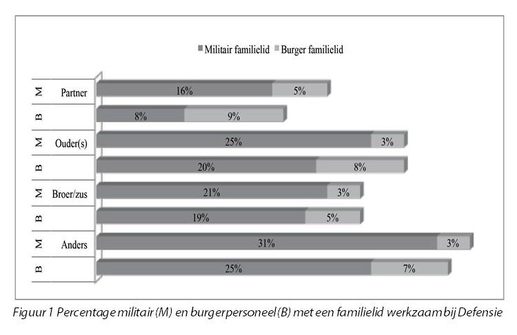 Defensiepersoneel is echter niet eerder specifiek bevraagd naar de werkrelaties tussen burgers en militairen en het managen van deze twee groepen personeel. Met dat doel zijn in de tweede fase van het onderzoek vragenlijsten verspreid onder defensiepersoneel. De Defensieteam Vragenlijst – een Nederlandse vertaling van het Canadese origineel – is in januari 2014 verstuurd naar de werkmailadressen van 1250 militairen en 1250 burgers, [3] werkzaam bij de bestuursstaf, het CDC, de DMO en staven van de OPCO’s. Operationele eenheden zijn buiten beschouwing gelaten omdat daar door de bank genomen geen burgers werkzaam zijn. De respons was 39 procent (n = 490) onder militairen en 35,5 procent (n = 444) onder burgers. Interessant is dat 42 procent van de burgers die de vragenlijst invulden eerder als militair werkzaam is geweest binnen Defensie en dus een militaire achtergrond heeft. Daarnaast heeft 41 procent van het burgerpersoneel een of meerdere familieleden die werkzaam zijn binnen Defensie, hetzij een partner (18 procent), ouder(s) (28 procent), broer of zus (24 procent), of een ander familielid (32 procent) die als burger maar veelal als militair bij Defensie werkt.[4] Dit verschilt niet zo veel van de militairen. Van hen heeft 46 procent een familielid bij Defensie (zie figuur 1). Dit laat zien dat de scheiding tussen burger en militair, en de kennis van elkaars achtergronden niet altijd zo strikt is gescheiden als men wel eens veronderstelt.