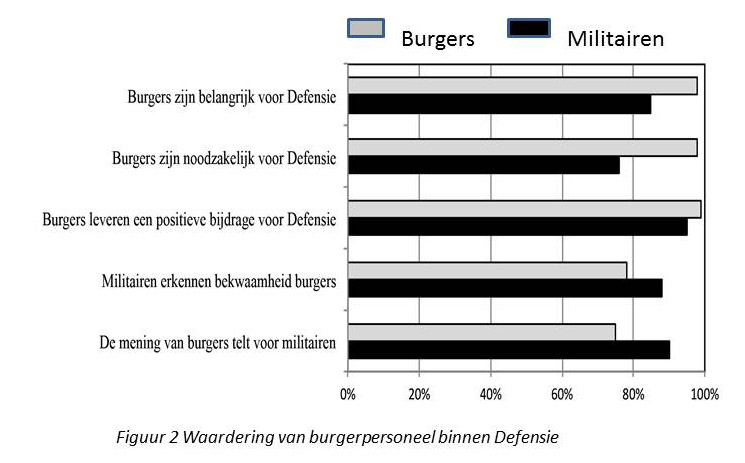 In vergelijking met militairen zijn burgers significant minder positief over respect, het gevoel erbij te horen en de onderlinge werkrelaties. Burgers met en zonder militaire achtergrond verschillen daarin niet van elkaar. Hoewel militairen en burgers gemiddeld positief antwoorden is het interessant te vermelden dat 9 procent van de militairen en 14 procent van de burgers aangeeft van de ander weinig respect te ervaren; dat 21 procent van de militairen en 30 procent van de burgers aangeeft niet het gevoel te hebben erbij te horen (wat duidt op een zekere mate van groepsvorming); dat 25 procent van de militairen en 29 procent van de burgers aangeeft dat er geen sprake is van een goede onderlinge communicatie; en dat 7 procent van de militairen en 11 procent van de burgers de kwaliteit van hun werkrelaties negatief beoordeelt.[17] Deze scores wijzen uit dat (kleine en soms toch ook wel grote) minderheden van het (burger-)personeel zich niet senang voelt in de organisatie. Dat is zonder meer een punt van aandacht.