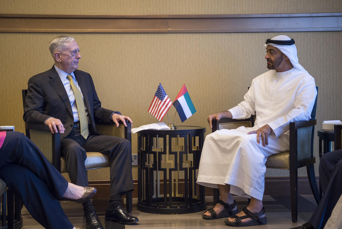 Toenmalig Amerikaans minister van Defensie Jim Mattis spreekt in 2017 in Abu Dhabi met de kroonprins van de Verenigde Arabische Emiraten, Mohammed bin Zayed al Nahyan. ‘MbZ’ is de facto de leider van de VAE, het land dat door Mattis ‘Little Sparta’ werd genoemd. Foto U.S. Air Force, Brigitte N. Brantley