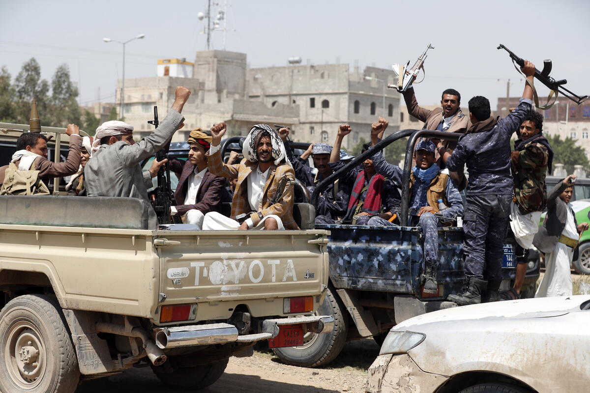 Gewapende medestanders van de Houthi-beweging in Jemen. De Houthi’s vormen een van de groepen waarmee onder andere de VAE in Jemen in een strijd verwikkeld zijn. Foto ANP, EPA, Yahya Arhab