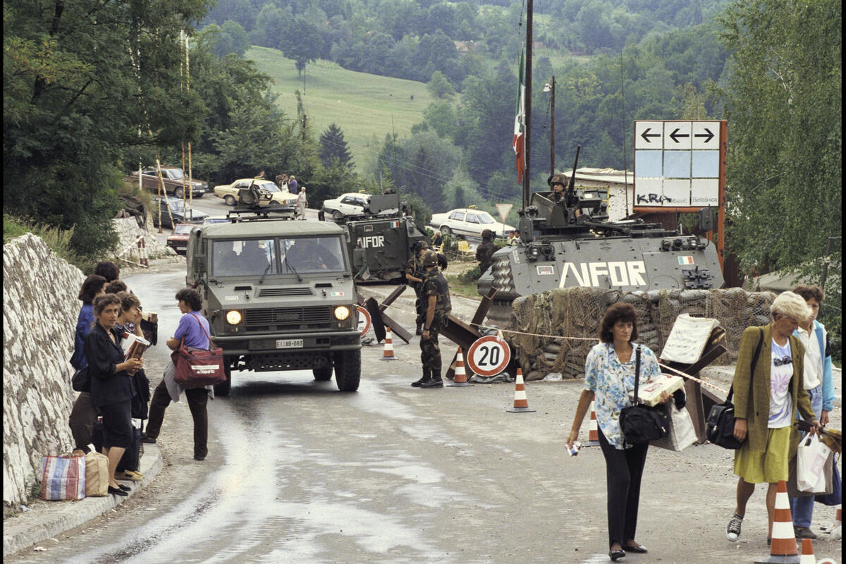Checkpoint in Sarajevo, Bosnië, bemand door Italiaanse troepen van IFOR. Het vredesverdrag van Dayton, dat een einde maakte aan de strijd in Bosnië, was een opgelegd akkoord. Foto NATO