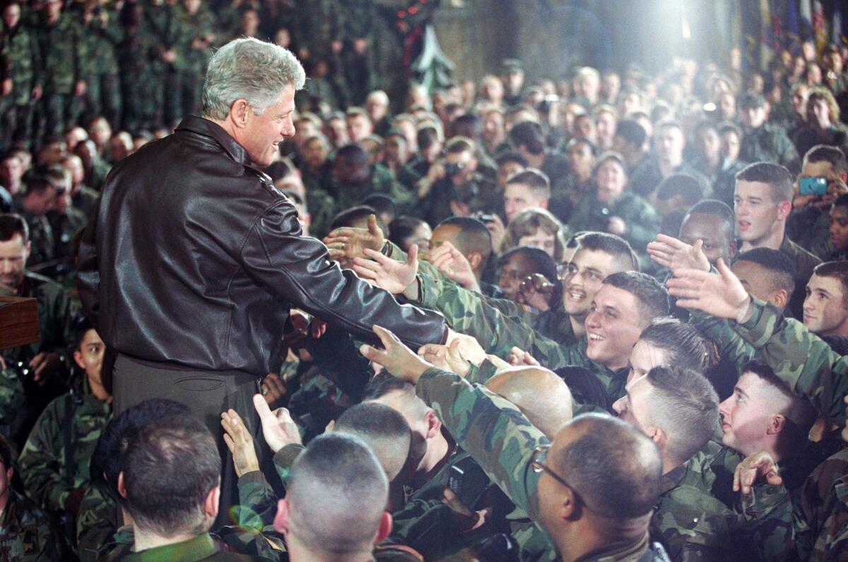 De Amerikaanse president Bill Clinton bezoekt troepen in Bosnië in 1997. In de haast om Amerikaanse soldaten naar huis te krijgen, werd Dayton een compromis. Foto William J. Clinton Presidential Library