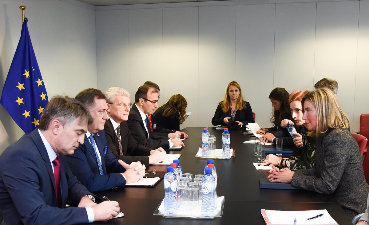 De Bosnische leiders Milorad Dodik, Željko Komšić en Šefik Džaferović ontmoeten Federica Mogherini, destijds de hoge vertegenwoordiger van de Europese Unie voor Buitenlandse Zaken en Veiligheidsbeleid. Foto Europese Commissie, Jennifer Jacquemart