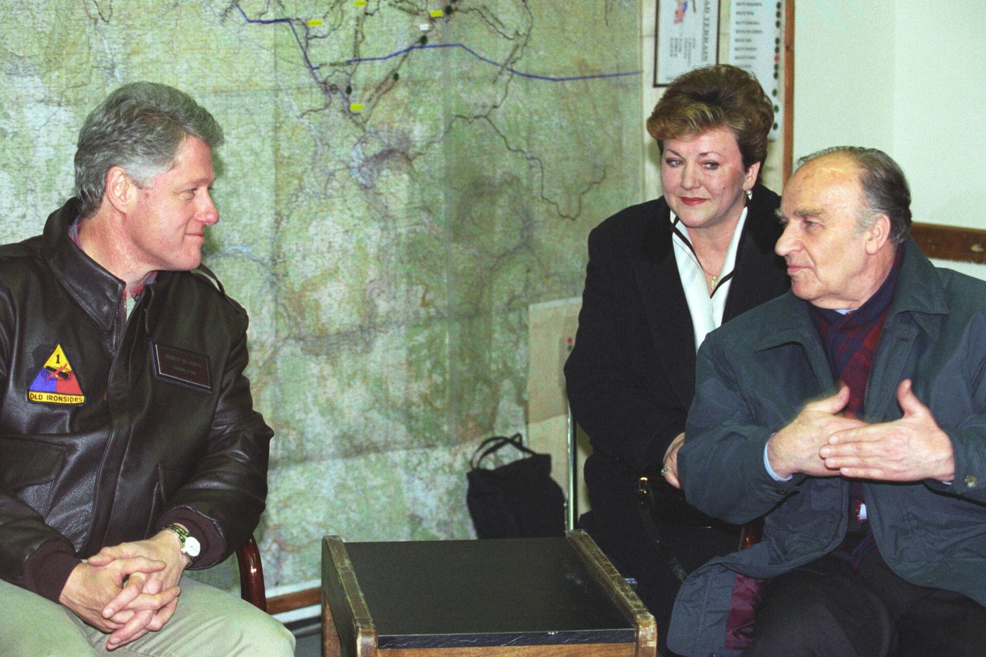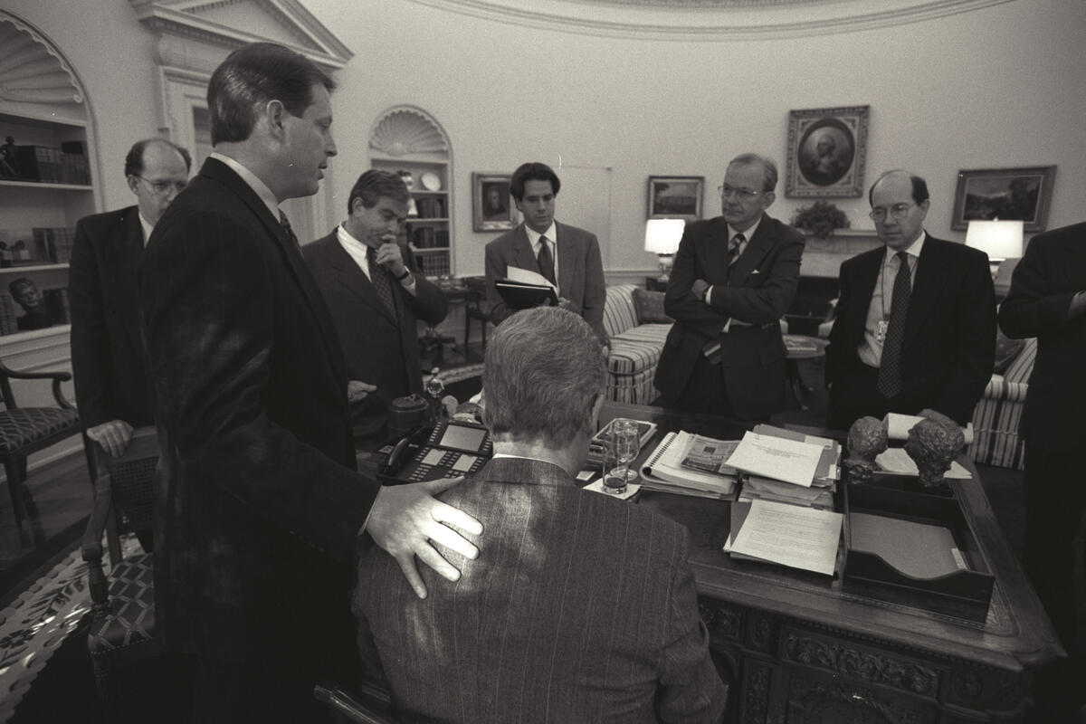 US President Bill Clinton and his advisors discuss remarks announcing the Bosnia-Herzegovina Peace Agreement. Photo William J. Clinton Presidential Library