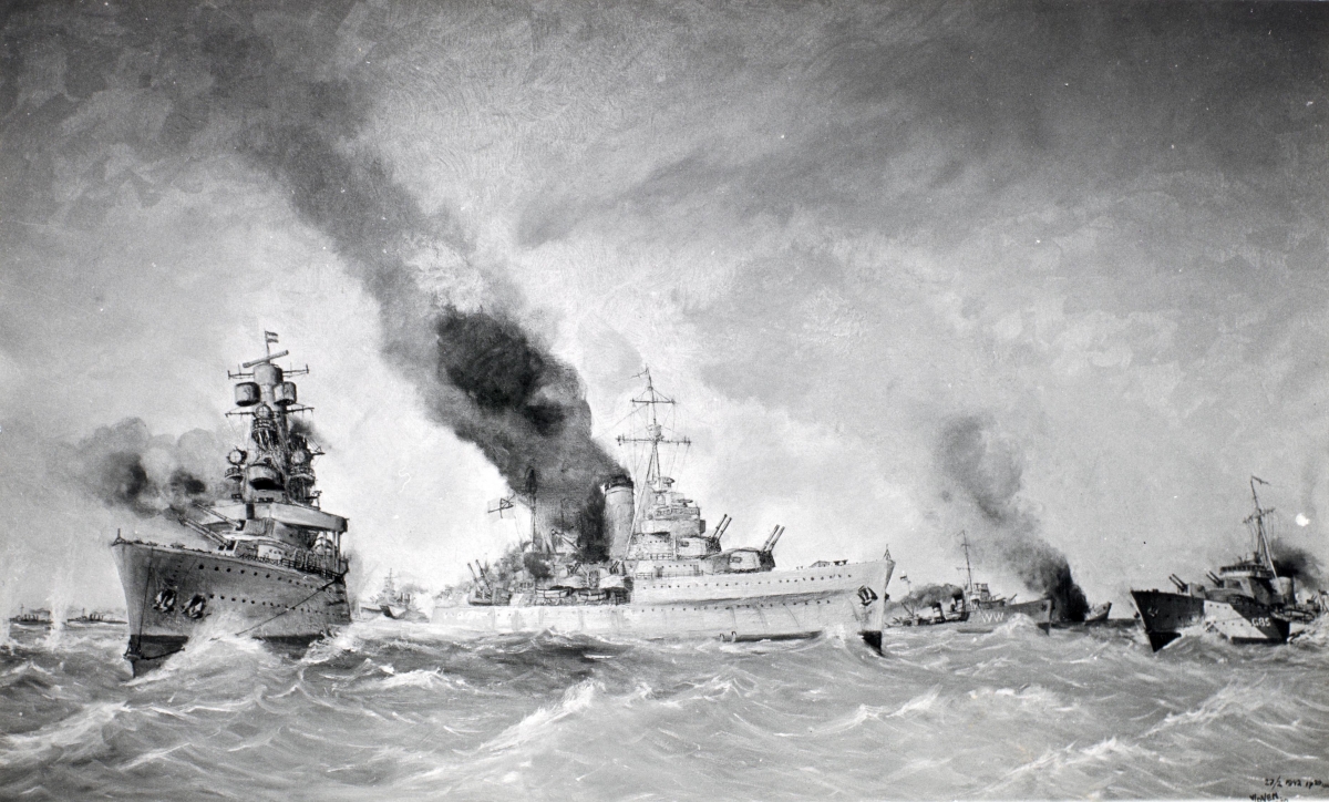 [16] Dit dramatische moment wordt ook in het bekende schilderij van Jan Hoowij, ‘Kruiser Hr.Ms. De Ruyter (1938-1942) passeert drenkelingen van torpedobootjager Hr.Ms. Kortenaer (1928-1942) tijdens de slag in de Javazee’, belicht.