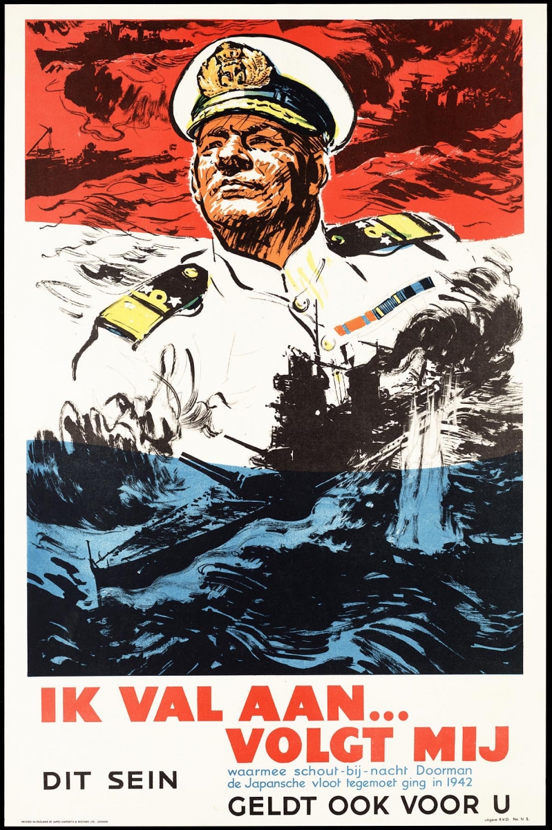 Tot in 1944 lijkt het verhaal van de slag vooral gebruikt te zijn om de Nederlandse bevolking te bemoedigen, waarbij de nadruk lag op het eerste deel van Doormans woorden: ‘Ik val aan.’ In een oorlog waarop Nederland in militaire zin niet echt zijn stempel wist te drukken, was dit verhaal van een offensieve strijd, in bondgenootschappelijk verband en onder Nederlandse leiding, een uniek en uiterst bruikbaar voorbeeld van agency. Toen het vooruitzicht van de bevrijding van Nederland concreter werd, verschoof het accent van bewondering voor Doormans moed naar de noodzaak om diens goede voorbeeld te volgen. De nadruk kwam te liggen op het tweede deel van het signaal, namelijk: ‘Volgt mij.’ Niemand kan de woorden van onze schout-bij-nacht vergeten, schreef bijvoorbeeld het illegale blad Overzicht der Nieuwsberichten in april 1944: ‘En duizenden volgden hem. Aan hen allen hebben wij grote verplichtingen. Zij zullen niét beschaamd worden.’[38] In het eveneens clandestien verspreide The London News werd enkele dagen later vrijwel hetzelfde gezegd: ‘Duizenden volgden. De verplichtingen die wij hebben jegens hen, die zich reeds offerden, zullen niet worden beschaamd.’[39] Beide bladen echoden hiermee de woorden van minister van Marine Furstner, in een toespraak voor Radio Oranje op 27 februari 1944: ‘Niemand vergeet het laatste bevel van kap. Doorman: Ik val aan; volg mij. Zij volgden.’[40] En volgen – dat moest nu ook de jeugd van Nederland doen, stelde de minister: ‘Zoolang Hitler nog bij ons de lakens uitdeelt, kunt gij, jongeren, alleen nog maar in het geheim strijden. Maar dit gaat voorbij, vermoedelijk spoedig en dan komt uw tijd.’ Nederlands-Indië, het landsdeel waarvoor Doorman en de zijnen zich hadden opgeofferd, diende bevrijd; een taak waarvoor ‘de volledige kracht van het Nederlandsche volk gemobiliseerd moet worden’, aldus Furstner.[41] Het Aanmeldingsbureau voor Oorlogsvrijwilligers in Heerlen maakte een half jaar later dezelfde koppeling tussen Doorman en de ‘flinke, sterke, jonge kerels’ die zijn karwei moesten afmaken. Het sein waarmee de schout-bij-nacht de vijand tegemoet ging, aldus een advertentie in het Limburgsch Dagblad, ‘geldt ook voor u’.[42] Dezelfde formulering werd gebruikt op een nog in Londen gedrukte rood-wit-blauwe propagandaposter van de Regeerings Voorlichtingsdienst, waarop een vastberaden vlootvoogd uittorent boven een scène uit de slag.[43]