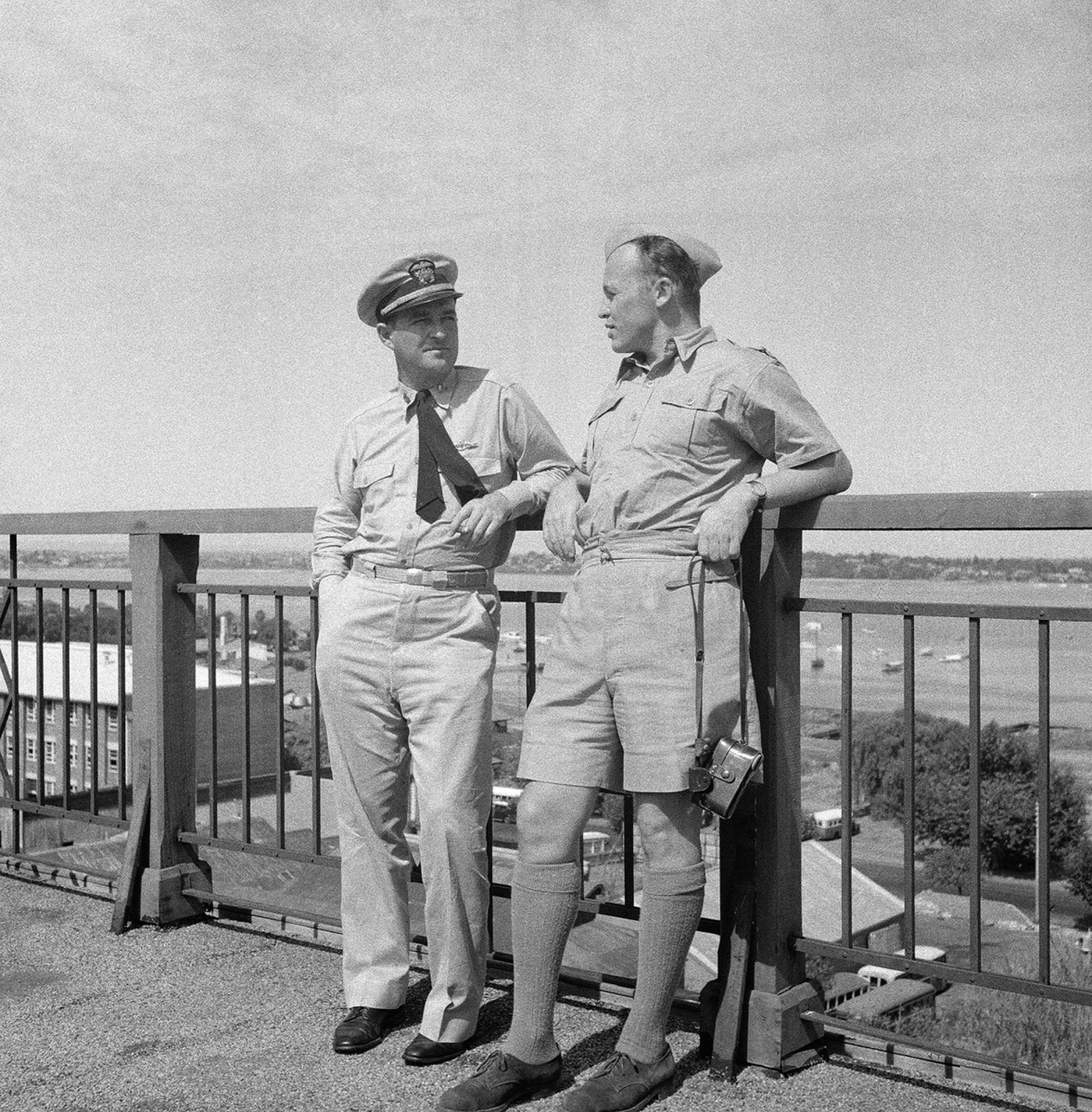 Oorlogscorrespondent George Weller (rechts) droeg bij aan de mythevorming door zijn meeslepende verhaal over de lotgevallen van de opvarenden van de Kortenaer