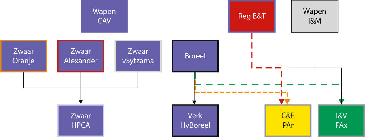 Ten slotte wordt de oprichting van het nieuwe Wapen en de herschikking binnen de Cavalerie als een project gedefinieerd. Kolonel Ed van de Broek wordt als projectleider aangesteld, een werkgroep en klankbord worden samengesteld en het geheel krijgt zodoende integrale stafbehandeling. De totale samenhang van dit project is schematisch weergegeven in Figuur 1.[22]