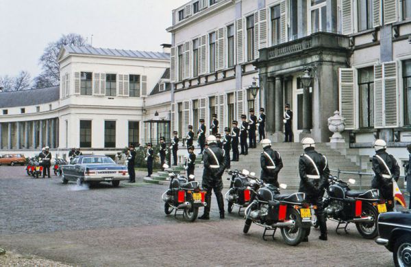 Marechaussees in ceremonieel tenue leveren een erewacht bij paleis Soestdijk, terwijl andere marechaussees klaar staan als motorescorte. Foto Marechausseemuseum