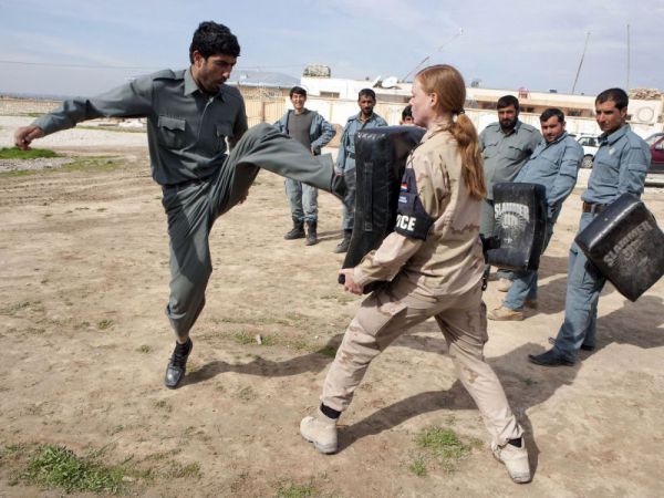 Politietraining door de Koninklijke Marechaussee in de praktijk: wachtmeester Andrea Tummers verzorgt een cursus zelfverdediging in Kunduz, maart 2013. Foto MCD, A. Schoor