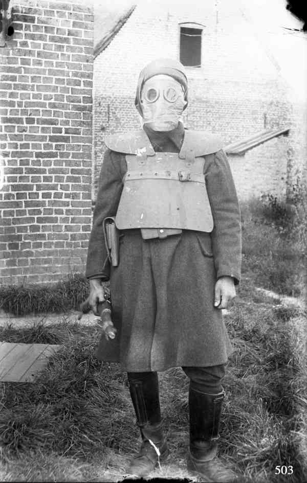 Een Belgische militair met de Italiaanse Farina borstplaat en helm die bestand waren tegen kogels en zware scherven. Hoewel bedoeld voor statisch gebruik door schildwachten, werden de helmen ook vaak gebruikt bij raids op Duitse voorposten en linies. Foto War Heritage Institute