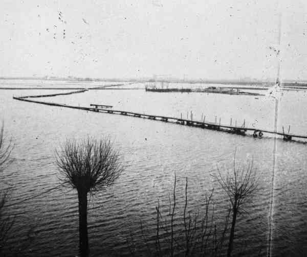 Zicht op de onderwaterzetting van de IJzervlakte die eind oktober 1914 het Belgische leger redde tijdens de Slag aan de IJzer Tot het einde van de oorlog deden de Belgen (en later ook de Duitsers) er alles aan om de onderwaterzetting in stand te houden. Foto War Heritage Institute