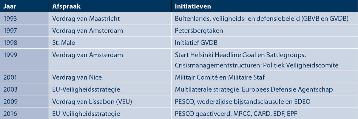 Tabel 1 schetst een overzicht van de ontwikkelingen van het EU-veiligheids- en defensiebeleid.