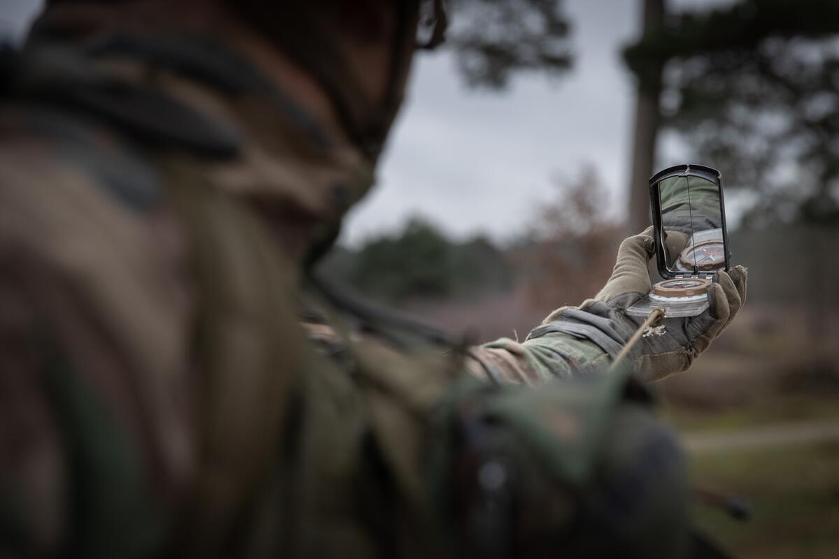 Een marinier bepaalt zijn richting met een kompas. Het aankomende Strategisch Kompas van de EU moet antwoord geven op nieuwe dreigingen en ingrijpende politieke verschuivingen. Foto MCD, Aaron Zwaal