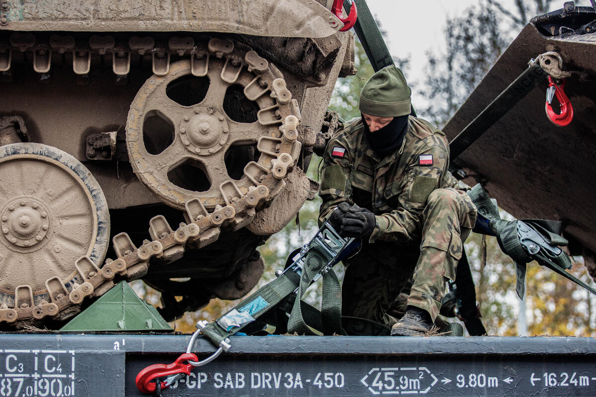 Een Poolse militair laadt pantservoertuigen op een trein. Militaire mobiliteit in Europa is een belangrijk thema voor zowel EU als NAVO, waarbij landen van beide organisaties inmiddels samenwerken. Foto NAVO