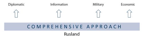 Het meest effectief is om DIME gecoördineerd in te zetten met andere organisaties in een interagency-benadering. Wanneer dit gebeurt, spreken we van een comprehensive approach (zie figuur 2).[23] Zoals hierboven beschreven heeft de Russische regering zelf al invloed op diverse organisaties en kan zij individueel een ogenschijnlijke interagency-benadering voeren: ‘In Vladimir Putin’s Russia, everyone is potentially […] both who they seem to be, and, at the same time, an instrument of the government.’[24] Rusland beschikt dus, naast de officiële staatsmacht in de vorm van DIME, over op papier onafhankelijke actoren, de officieuze kant van DIME. Die actoren kan Rusland door de hoge mate van centrale invloed gecoördineerd[25] inzetten om een offensieve comprehensive approach te creëren terwijl het de officiële betrokkenheid kan ontkennen: alle ingrediënten voor een succesvolle vorm van hybride oorlogvoering.