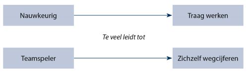 Dit model gaat ervan uit dat ieder mens bepaalde kernkwaliteiten heeft maar dat deze kunnen leiden tot valkuilen als je hierin doorschiet.[26] Wanneer iemand bijvoorbeeld heel gedetailleerd te werk gaat, kan zijn valkuil zijn dat hij erg traag werkt. Een echte teamspeler kan zijn eigen belangen misschien minder goed behartigen als hij daarin doorschiet; zichzelf wegcijferen is dan zijn valkuil (zie figuur 3). Dit model past goed in de hybride benadering waarin indirectheid en ambiguïteit grote rollen spelen.
