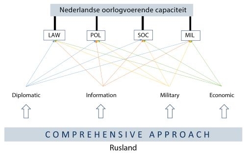 Daarmee laat de figuur zien wat de aangrijpingspunten en gerelateerde verschijningsvormen kunnen zijn op politiek-strategisch en operationeel-tactisch niveau van een succesvolle hybride operatie van Rusland. Met een indirecte benadering kan Rusland die valkuilen realiseren en daarmee de oorlogvoerende capaciteit van Nederland aantasten zonder over te gaan op een oorlog in een juridische zin.