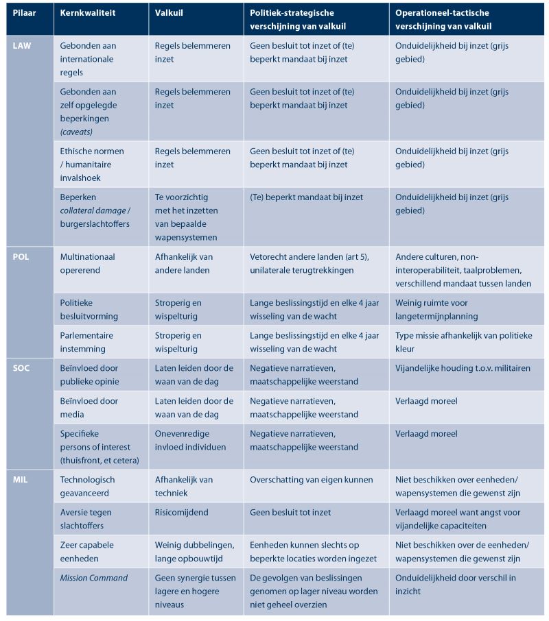 Zoals duidelijk wordt bij de valkuilen van de LAW-steunpilaar, is het optreden van Nederlandse militairen precies beschreven in verdragen, internationale afspraken en mandaten. Hierin staat zo nauwkeurig mogelijk wat wel en wat niet mag. Een potentiële tegenstander weet dit en gaat de grijze gebieden opzoeken, hiermee creëert het dus de valkuil voor Defensie. Defensie is niet in staat om bijvoorbeeld eigenhandig het recht op zelfverdediging in het VN-Handvest aan te passen, dus ze zal moeten leren leven met de consequenties. Zo zullen oefeningen een grotere rol moeten reserveren voor bewapende burgers of militairen zonder insignes en bijvoorbeeld de plaatsing van vitale vijandige communicatieapparatuur in ziekenhuizen.