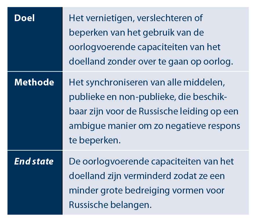 Rusland is assertief en wil politiek-strategische doelen realiseren zonder oorlog te voeren. Volgens het Handboek Militaire Begrippen Land voeren staten oorlog om twee redenen: de ander jouw politieke wil opleggen en/of zijn oorlogvoerende capaciteit uitschakelen.[21] Hybride oorlogvoering is dus ook tweeledig. De aandacht in het Westen lijkt echter vooral uit te gaan van het eerste onderdeel, het tegengaan van het opleggen van de politieke wil is namelijk waar de actieplannen van de NAVO, EU en Nederland zich op lijken te richten. Maar voor Defensie is juist het tweede aspect van oorlogvoering van groot belang: het uitschakelen van de Nederlandse oorlogvoerende capaciteit. Als het Rusland lukt dit te realiseren zonder over te gaan op daadwerkelijke oorlog, is het vanuit Russisch perspectief zeer aantrekkelijk. Als je dit voor Rusland overzichtelijk maakt in een schema bestaande uit doel, methode en end state, kom je op het volgende uit: