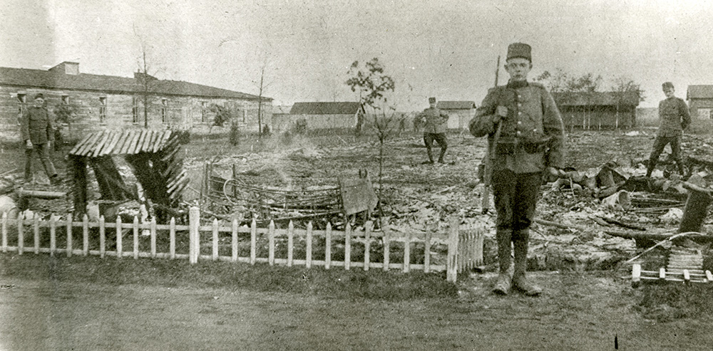 Een wacht bij een van de afgebrande barakken na relletjes die in oktober 1918 uitbraken in legerplaats De Harskamp; de onrust deed ook binnen het kabinet de vrees voor een revolutie oplaaien