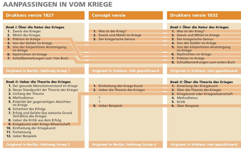 We mogen dus concluderen dat de manuscripten in Berlijn en Koblenz allemaal behoren tot de revisie die Clausewitz in juli 1827 start. We kunnen nu ook dat proces in detail volgen als het gaat om de Boeken I en II. Clausewitz herschrijft in totaal acht hoofdstukken en neemt zes oude over. In het schema is dit met doorgetrokken lijnen weergegeven. Als hij in 1830 zijn wetenschappelijke studie stopt om weer in actieve dienst te gaan, zijn deze twee Boeken slechts in concept gereed. Na zijn dood zorgt zijn vrouw ervoor dat ze in het net worden overgeschreven (zie schema: twee rechtse blokken). En die twee Boeken worden vervolgens in 1832 daadwerkelijk gepubliceerd. Voor een goed begrip, we weten dus niet hoe de revisie in de overige zes Boeken van Vom Kriege is geweest. Maar voor deze twee Boeken is de revisie wel volledig inzichtelijk geworden.