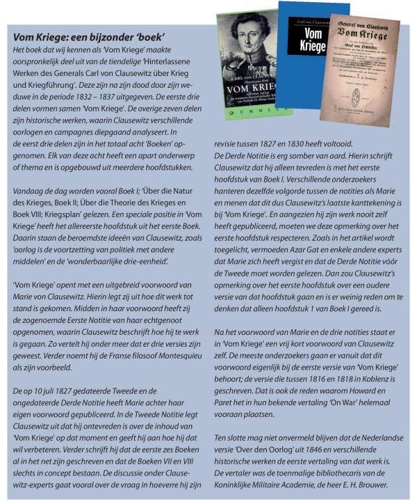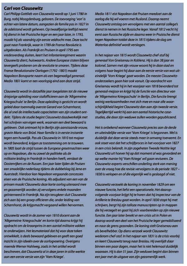 In Breda vond ik een vrijwel vergeten tekst van Clausewitz, die mogelijk de eerste versie van Vom Kriege is. In Koblenz bleken twee geheel onbekende manuscripten al 25 jaar in een kluis te liggen. En in Berlijn zag ik dat een ander geschrift verkeerd was gedateerd. In dit artikel vertel ik over deze drie ontdekkingen en leg ik uit wat ze volgens mij betekenen voor de hedendaagse interpretatie van Clausewitz. Uiteraard begin ik met een korte beschrijving van de verschillende visies. In aparte kaders wordt het leven van Clausewitz en de bijzondere samenstelling van Vom Kriege besproken voor diegenen die daar niet helemaal in thuis zijn.