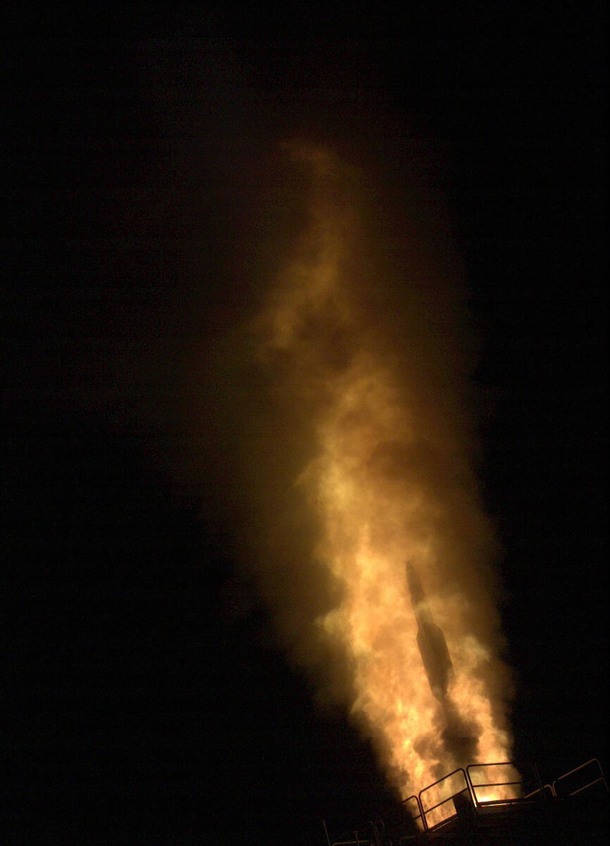 Een Amerikaanse Aegis-interceptorraket wordt gelanceerd. Salvo’s en combinaties van raketten, drones en loitering munitions kunnen bestaande verdedigingssystemen overweldigen. Foto U.S. Missile Defense Agency