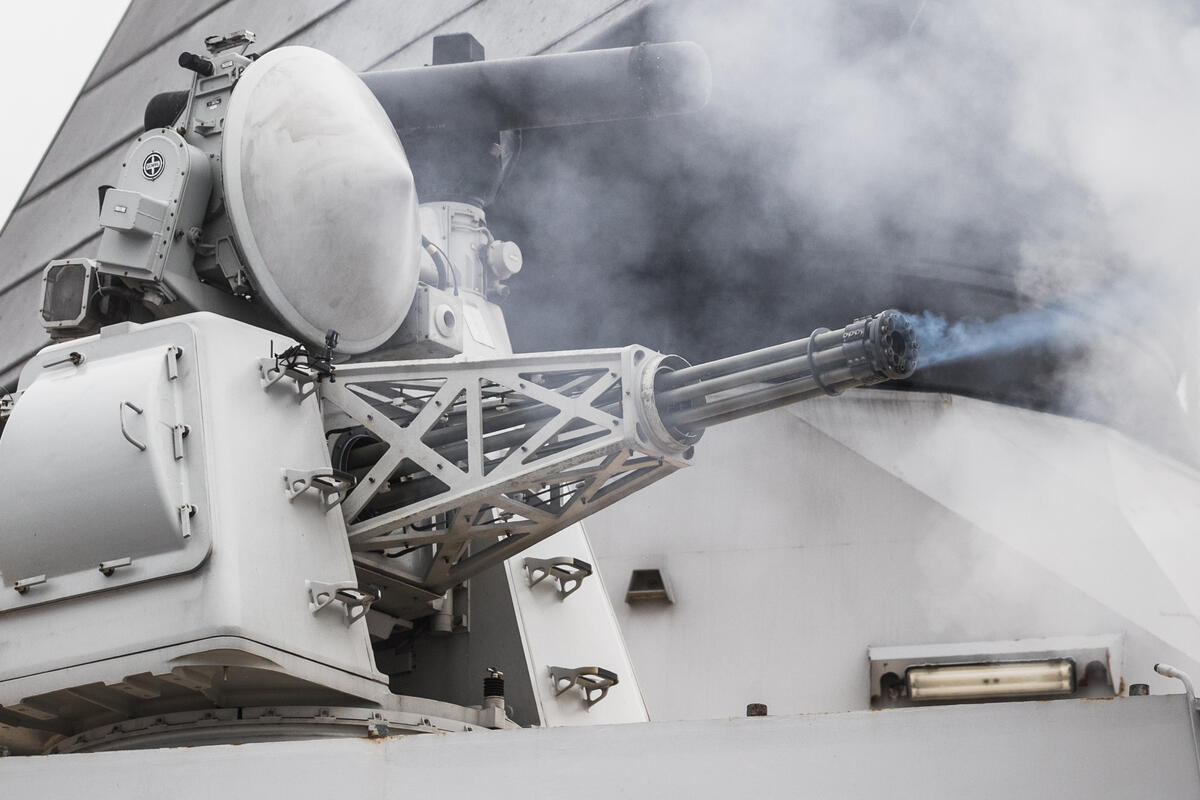 Oefening met het Goalkeeper-systeem op het Nederlandse luchtverdedigings- en commandofregat (LCF) Zr.Ms. Evertsen. Binnen het geheel aan Europese capaciteit heeft Nederland een potentiële rol te vervullen met de luchtverdedigingsfregatten met SMART-L MM-radars. Foto MCD, Jan Dijkstra