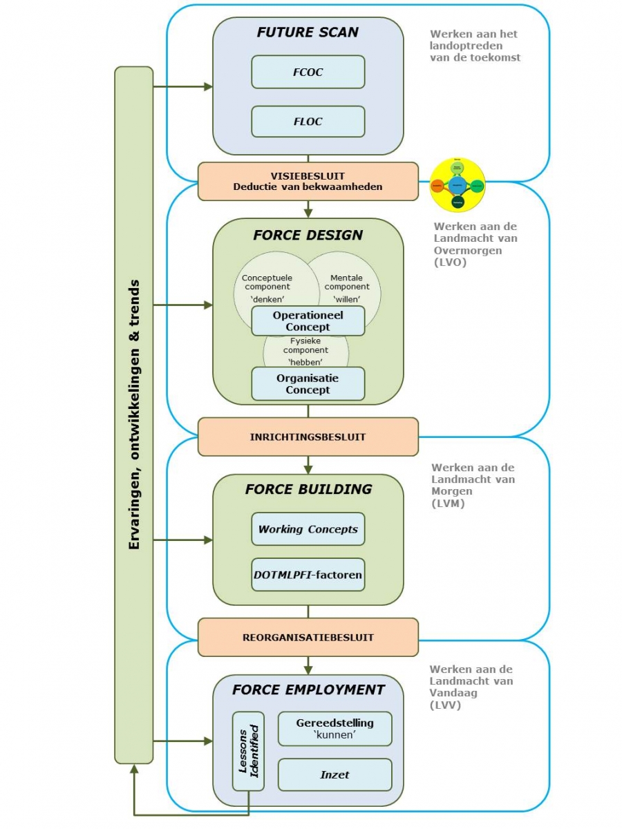 Beide processen leggen de basis voor Force Building (LvM). Dit derde stadium omvat het beschrijven van zogeheten working concepts. Hierin wordt bijvoorbeeld het optreden van ketens of organisatiedelen weergegeven. De hiervoor benodigde capaciteiten worden vertaald in de zogeheten DOTMLPFI-factoren.[7] Working concepts kunnen leiden tot reorganisatieprojecten en hebben een directe relatie met de conceptuele onderbouwing voor behoeftestellingen. Het laatste stadium is Force Employment, de Landmacht van Vandaag (LvV), waarbij gereedstelling en inzet van eenheden de dagelijkse praktijk zijn.