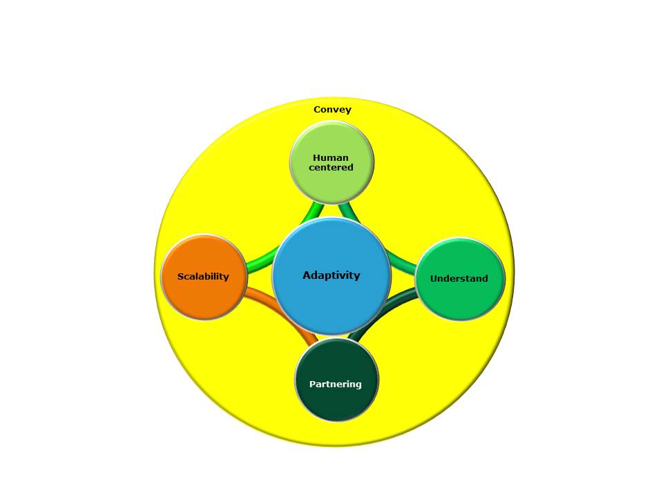 Het ability-model is weergegeven in figuur 4 en kent model kent vier subelementen: human centered, understand, partnering en scalability, rond het kernelement adaptivity (aanpassingsvermogen). De bekwaamheden zijn onderling aan elkaar gerelateerd en worden ondersteund door het element convey. De elementen van het ability-model worden hieronder verder uitgewerkt en toegelicht.