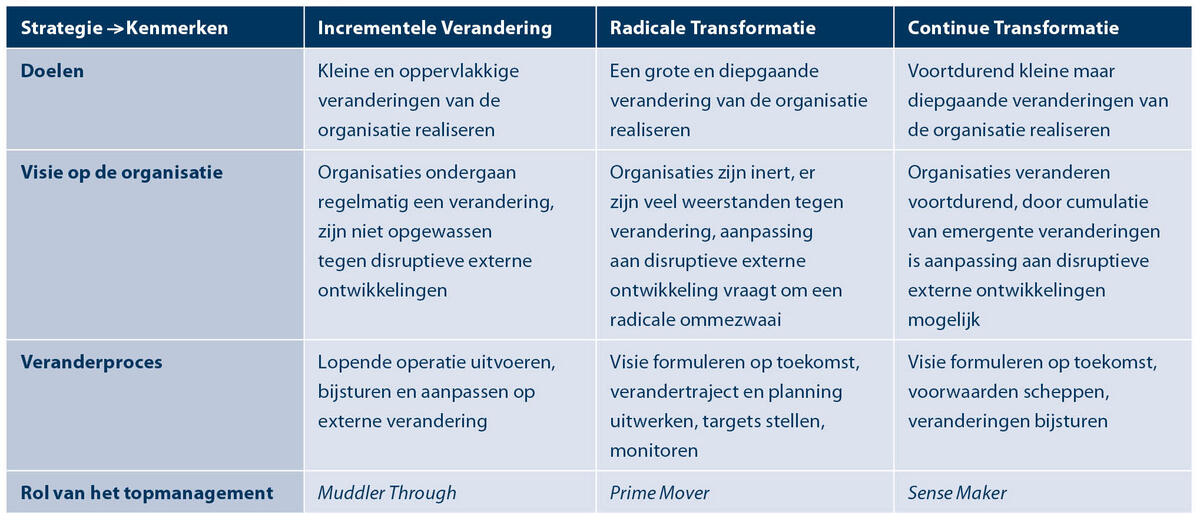 Het management — in het geval van de krijgsmacht de topstructuur van Defensie — is bij een incrementele veranderstrategie primair gericht op de lopende operatie en doet aan muddling through waar het verandering betreft.[30] Bij radicale transformatie is het topmanagement juist de prime mover die de transformatie creëert en realiseert. Bij continue transformatie, tot slot, is het topmanagement vooral een sense maker die aanwezige veranderingen bijstuurt in de richting van een duidelijk geformuleerde visie.[31] Een samenvatting van de verschillen tussen de veranderstrategieën staat in figuur 1.