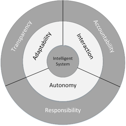 In scientific literature, AI is described as more than an Intelligent System alone. It is characterized by the concepts of Adaptability, Interactivity and Autonomy (Floridi & Sanders, 2004) as depicted in the inner layer of figure 1 (Dignum, 2016). Adaptability means that the system can change based on its interaction and can learn from its experience. Machine learning techniques are an example of this. Interactivity occurs when the system and its environment act upon each other and autonomy means that the system itself can change its state. These characteristics may lead to undesirable behaviour or uncontrollable activities of AI as scenarios of many science fiction movies have shown us. Although these scenarios are often not realistic, a growing body of researchers is focusing on responsible design of AI, for example on the social dilemmas of autonomous vehicles (Bonnefon, Shariff, & Rahwan, 2016), to get insight into societal concerns about this kind of technology. Principles to describe Responsible AI are Accountability, Responsibility and Transparency (ART) which are depicted in the outer layer of figure 1. Accountability refers to the justification of the actions taken by the AI, Responsibility allows for the capability to take blame for these actions and Transparency is concerned with describing and reproducing the decisions the AI makes and adepts to its environment (Dignum, 2016).