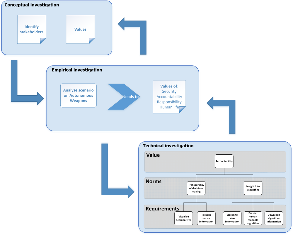 The VSD should not been seen as a separate design method, but it can be used to augment an already used and established design process such as the waterfall or spiral model. The VSD can be used as a roadmap for engineers and students to incorporate ethical considerations into the design (Cummings, 2006). I will use the three phases of the VSD approach as a method to show the elicitation of values for a responsible design of autonomous weapons.