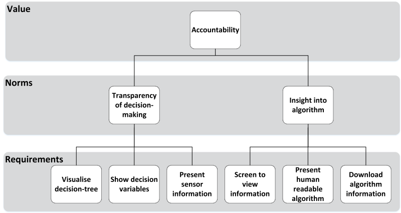 In the technical investigation phase the specific features of the autonomous weapons technology are analysed and requirements for the design can be specified. Translating values into design requirements can be done by means of a value hierarchy (Van de Poel, 2013). This hierarchical structure of values, norms and design requirements makes the value judgements, that are required for the translation, explicit, transparent and debatable. The explicity of values allows for critical reflection in debates and pinpoint the value judgements that are disagreed on. In this section I will use this method to create a value hierarchy for autonomous weapons for the value of accountability.