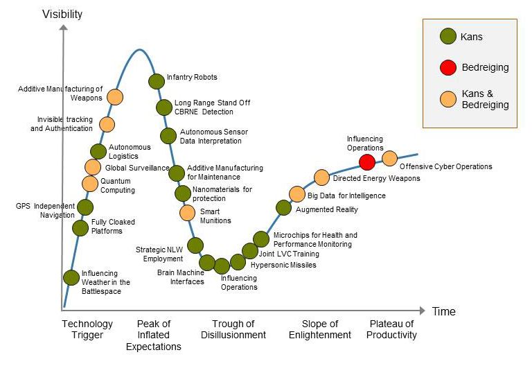 Op de Hype Cycle staat helemaal rechts op het Plateau of Productivity een innovatie die in de technologieverkenning offensieve cyberoperaties wordt genoemd. Het gaat hier om het uitvoeren van militaire operaties gericht op het verstoren, misleiden, veranderen of vernietigen van systemen en netwerken van de tegenstander met digitale middelen.[24] Deze middelen kunnen eenvoudige stukjes code zijn zoals een computervirus, maar ook complexe software die is geschreven op basis van social engineering of gerichte inlichtingenoperaties. Een bekend voorbeeld is het Stuxnet-virus, dat is ingezet om de nucleaire opwerkingscentrale in Natanz in Iran stil te leggen en dat wel wordt beschouwd als het eerste cyberwapen. Het gebruik van cyberwapens is inmiddels wijdverbreid. Cyberspace geldt al enige tijd als de vijfde dimensie van oorlogvoering (na land, lucht, zee en ruimte) en ook de Nederlandse krijgsmacht zet hier fors op in. Sinds 2014 is er het Defensie Cybercommando, met daarbinnen een Defensie Cyber Expertisecentrum en een Joint Sigint Cyber Unit van de inlichtingendiensten MIVD en AIVD. Voor cyberwapens is voortdurende innovatie nodig. Digitale wapens kennen immers een beperkte houdbaarheidsduur: het wapen is bij inzet meteen achterhaald, omdat via internet gemakkelijk van de kenmerken en effecten van de aanval kennis kan worden genomen.